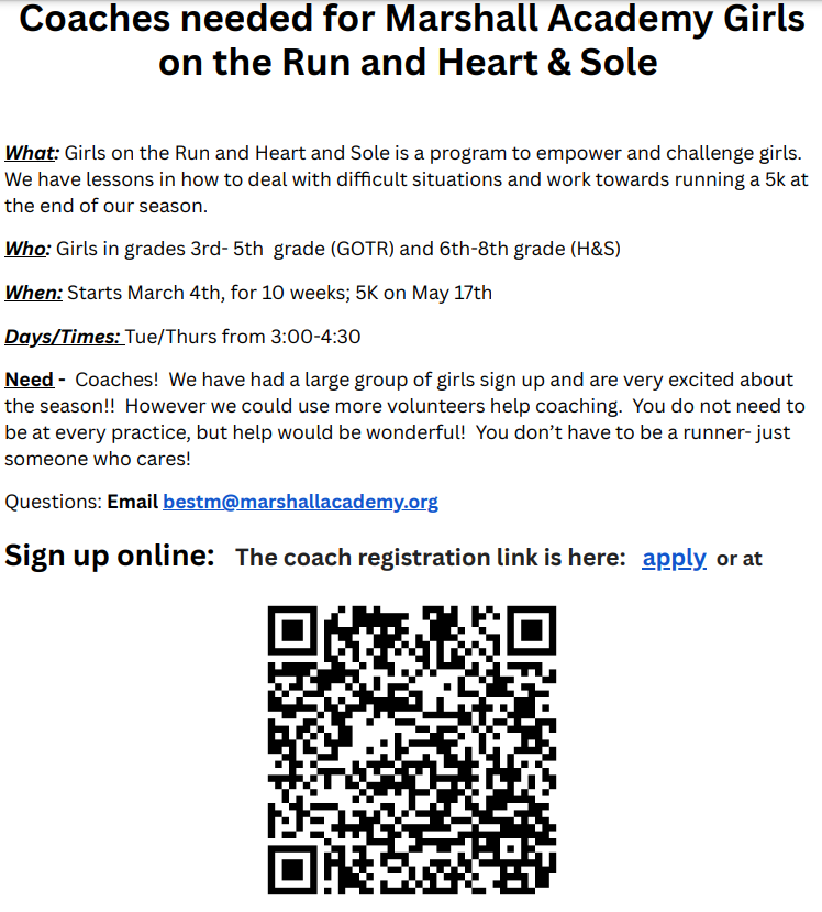 If you are a parent/guardian/grandparent/aunt/uncle, consider volunteering to work a Fund-raiser Friday here at Marshall Academy! Many hands will make light work! If you are a community member that just wants to support Marshall Academy, you are welcome to volunteer as well!